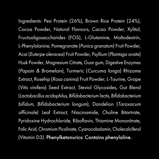 INGREDIENTS: Pea Protein (26%)*, Brown Rice Protein (24%)*, Cocoa Powder, Natural Flavours, Cacao Powder*, Xylitol, Fructooligosaccharides (FOS), L-Glutamine, Maltodextrin, L-Phenylalanine, Pomegranate (Punica granatum) Fruit Powder, Acai (Euterpe oleracea) Fruit Extract, Psyllium (Plantago ovata) Husk Powder, Magnesium Citrate, Guar gum, Digestive Enzymes (Papain & Bromelain), Turmeric (Curcuma longa) Rhizome Extract, Rosehip (Rosa canina) Fruit Powder, L-Taurine, Grape (Vitis vinifera) Seed Extract, Steviol Glycosides, Probiotic Blend (Lactobacillus acidophilus, Bifidobacterium lactis, Bifidobacterium bifidum, Bifidobacterium longum), Dandelion (Taraxacum officinale) Leaf Extract, Niacinamide, Choline Bitartrate, Pyridoxine Hydrochloride, Riboflavin, Thiamine Mononitrate, Cholecalciferol (Vitamin D3), Chromium Picolinate, Folic Acid, Cyanocobalamin. *Organic ingredients.