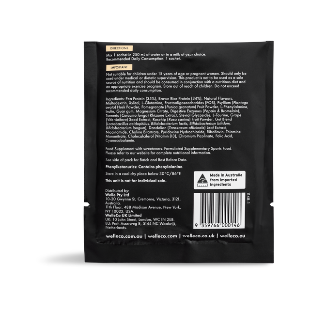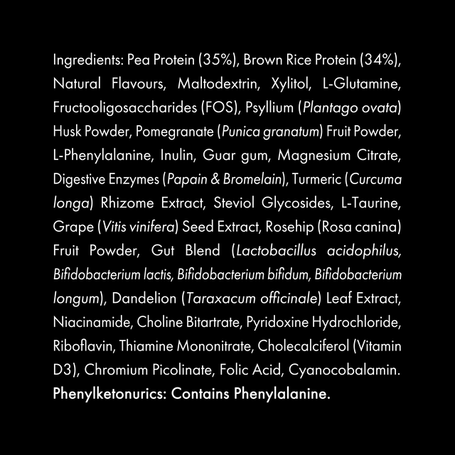 INGREDIENTS: Organic Pea Protein (35%), Organic Brown Rice Protein (34%), Natural Flavours, Maltodextrin, Xylitol, L-Glutamine, Fructooligosaccharides (FOS), Psyllium (Plantago ovata) Seed Husk, Pomegranate (Punica granatum) Powder, L-Phenylalanine, Inulin, Guar gum, Magnesium Citrate, Digestive Enzyme Blend (Papain & Bromelain), Tumeric (Curcuma longa) Root Extract, Steviol Glycosides, Rosehip (Rosa canina) Fruit Powder, Taurine, Grape (Vitis vinifera) Seed Extract, Vitamin Blend (Niacinamide, Chlorine Bitartrate, Pyridoxine Hydrochloride, Riboflavin, Thiamine Mononitrate, Folic Acid, Cyanocobalamin, Colecalciferol (Vitamin D3)), Probiotic Blend (Lactobacillus acidophilus, Bifidobacterium lactis, Bifidobacterium bifidum, Bifidobacterium), Dandelion (Taraxacum officinale) Leaf Extract, Chromium Picolinate.