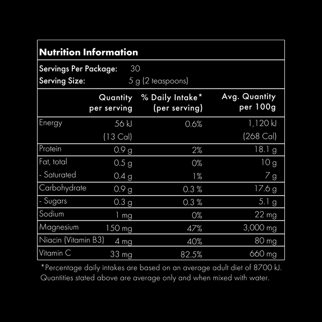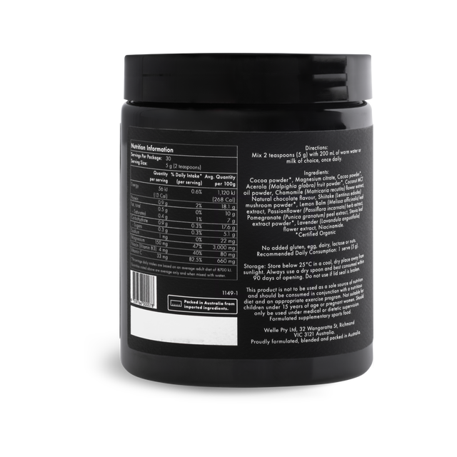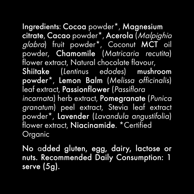 Each serve (5 g) contains: Cocoa powder*, Magnesium citrate, Cacao powder*, Acerola (Malpighia glabra) fruit powder*, Coconut MCT oil powder, Chamomile (Matricaria recutita) flower extract, Natural chocolate flavour, Shiitake (Lentinus edodes) mushroom powder*, Lemon Balm (Melissa officinalis) leaf extract, Passionflower (Passiflora incarnata) herb extract, Pomegranate (Punica granatum) peel extract, Stevia leaf extract*, Lavender (Lavandula angustifolia) flower extract, Niacinamide. *Certified Organic