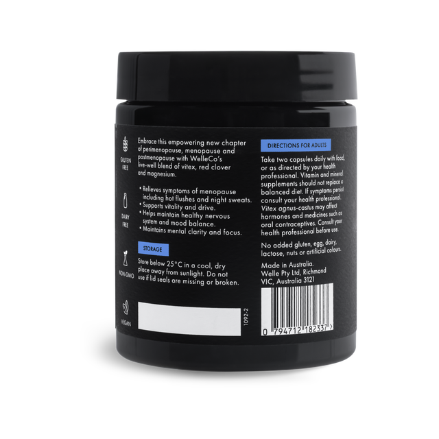 Revitalise your core feminine from the inside. These convenient, vegan capsules support you through every stage of menopause - perimenopause, menopause and post menopause - by providing vitality, balance and clarity in every phase of your body’s wonderous regenerative process. Replenish your passion for life with this proven blend of red clover, chasteberry and Siberian ginseng, while nurturing your inner calm with magnesium and hops. Take just 2 capsules daily to enjoy the vibrant, fulfilling life you long for.