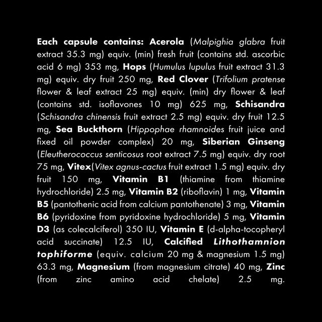 INGREDIENTS: Acerola (Malpighia glabra fruit extract 35.3 mg) equiv. (min) fresh fruit (contains std. ascorbic acid 6 mg) 353 mg, Hops (Humulus lupulus fruit extract 31.3 mg) equiv. dry fruit 250 mg, Red Clover (Trifolium pratense flower & leaf extract 25 mg) equiv. (min) dry flower & leaf (contains std. isoflavones 10 mg) 12.5 mg, Schisandra (Schisandra chinensis fruit extract 2.5 mg) equiv. dry fruit 12.5 mg, Sea Buckthorn (Hippophae rhamnoides fruit juice and fixed oil powder complex) 20 mg, Siberian Ginseng (Eleutherococcus senticosus root extract 7.5 mg) equiv. dry root 75 mg, Chasteberry (fruit extract 1.5 mg) equiv. dry fruit 150 mg, Vitamin B1 (thiamine from thiamine hydrochloride) 2.5 mg, Vitamin B2 (riboflavin) 1 mg, Vitamin B5 (pantothenic acid from calcium pantothenate) 3 mg, Vitamin B6 (pyridoxine from pyridoxine hydrochloride) 5 mg, Vitamin D3 (as colecalciferol) 350 IU, Vitamin E (d-alpha-tocopheryl acid succinate) 12.5 IU, Calcified Lithothamnion tophiforme (equiv. calcium 20 mg & magnesium 1.5 mg) 63.3 mg, Magnesium (from magnesium citrate) 40 mg, Zinc (from zinc amino acid chelate) 2.5 mg. Proudly formulated and manufactured in Australia. We source only the finest imported ingredients from our trusted suppliers. No added gluten, egg, dairy, lactose, soy, and nuts. No artificial flavours, colours, or sweeteners.