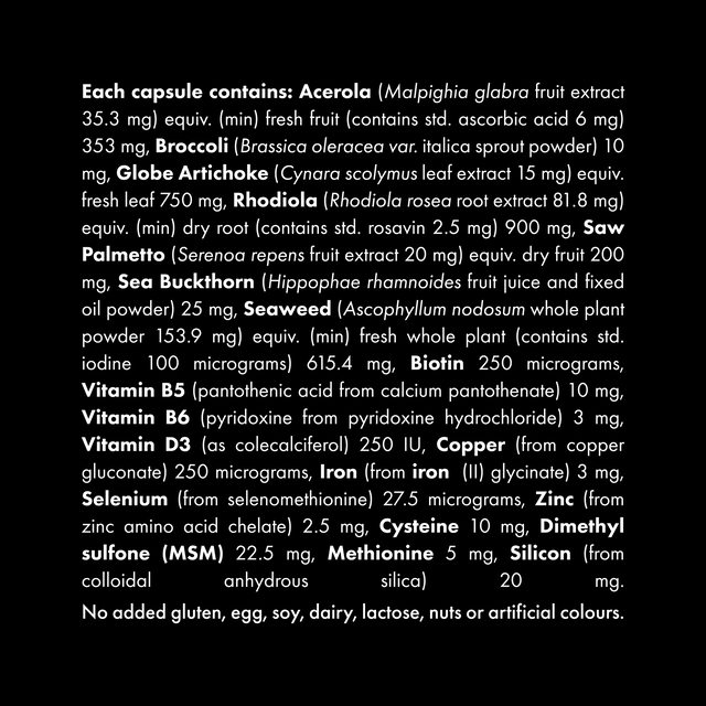 Each capsule contains: Acerola (Malpighia glabra fruit extract 35.3 mg) equiv. (min) fresh fruit (contains std. ascorbic acid 6 mg) 353 mg, Broccoli (Brassica oleracea var. italica sprout powder) 10 mg, Globe Artichoke (Cynara scolymus leaf extract 15 mg) equiv. fresh leaf 750 mg, Rhodiola (Rhodiola rosea root extract 81.8 mg) equiv. (min) dry root (contains std. rosavin 2.5 mg) 900 mg, Saw Palmetto (Serenoa repens fruit extract 20 mg) equiv. dry fruit 200 mg, Sea Buckthorn (Hippophae rhamnoides fruit juice and fixed oil powder complex) 25 mg, Seaweed (Ascophyllum nodosum whole plant powder 153.9 mg) equiv. (min) fresh whole plant (contains std. iodine 100 micrograms) 615.4 mg, Biotin 250 micrograms, Vitamin B5 (pantothenic acid from calcium pantothenate) 10 mg, Vitamin B6 (pyridoxine from pyridoxine hydrochloride) 3 mg, Vitamin D3 (as colecalciferol) 250 IU, Copper (from copper gluconate) 250 micrograms, Iron (from iron (II) glycinate) 3 mg, Selenium (from selenomethionine) 27.5 micrograms, Zinc (from zinc amino acid chelate) 2.5 mg, Cysteine 10 mg, Dimethyl sulfone (MSM) 22.5 mg, Methionine 5 mg, Silicon (from colloidal anhydrous silica) 20 mg.