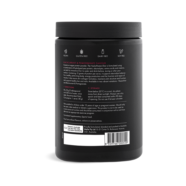 A premium vegan protein powder, The HydroProtein Elixir is formulated using a combination of hydrolysed pea protein, electrolytes, amino acids and vitamins. Containing 15 grams of protein per serve, it supports electrolyte balance for a healthy, performing body, energy production and the function and repair of muscles.