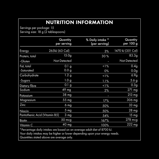 Each serve contains: Hydrolysed Pea Protein (45%), L-Glutamine, Glycine, L-Alanine, Natural Flavour, L-Proline, BCAA Blend 2:1:1 (L-Leucine, L-Isoleucine, L-Valine), Malic Acid, Electrolyte Blend (3%) (Magnesium Citrate, Potassium Citrate, Sodium Chloride), Citric Acid, Turmeric (Curcuma longa) Root Extract, Digestive Enzyme Blend (Protease, Amylase, Lipase, Cellulase, Lactase), Zinc Gluconate, Ascorbic Acid, Passionfruit (Passiflora edulis) Fruit Powder (0.2%), Sodium Hyaluronate, Stevia Leaf Extract, Niacin, Calcium Pantothenate, Biotin.