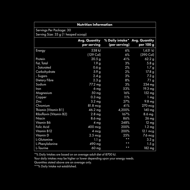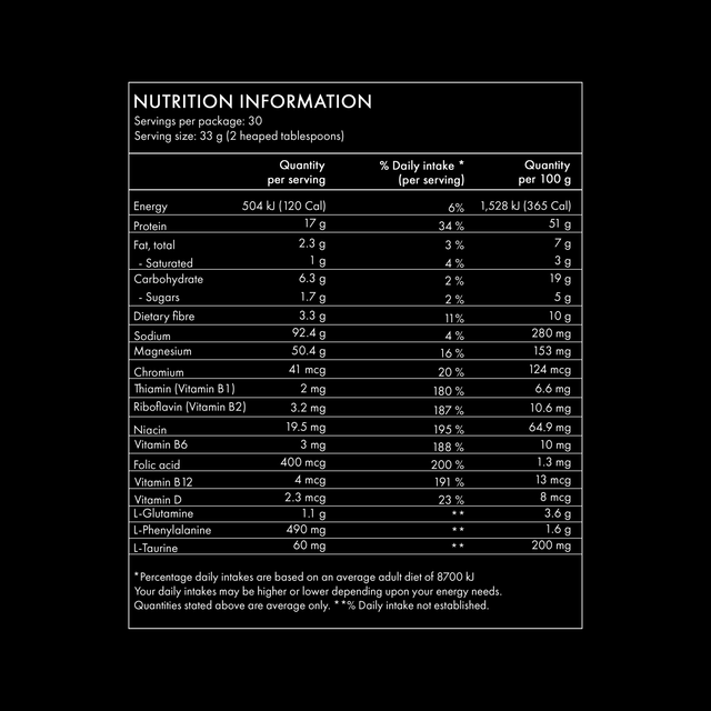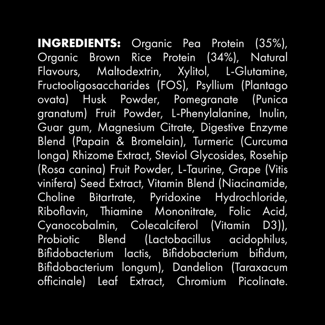 INGREDIENTS: Organic Pea Protein (35%), Organic Brown Rice Protein (34%), Natural Flavours, Maltodextrin, Xylitol, L-Glutamine, Fructooligosaccharides (FOS), Psyllium (Plantago ovata) Seed Husk, Pomegranate (Punica granatum) Powder, L-Phenylalanine, Inulin, Guar gum, Magnesium Citrate, Digestive Enzyme Blend (Papain & Bromelain), Tumeric (Curcuma longa) Root Extract, Steviol Glycosides, Rosehip (Rosa canina) Fruit Powder, Taurine, Grape (Vitis vinifera) Seed Extract, Vitamin Blend (Niacinamide, Chlorine Bitartrate, Pyridoxine Hydrochloride, Riboflavin, Thiamine Mononitrate, Folic Acid, Cyanocobalamin, Colecalciferol (Vitamin D3)), Probiotic Blend (Lactobacillus acidophilus, Bifidobacterium lactis, Bifidobacterium bifidum, Bifidobacterium), Dandelion (Taraxacum officinale) Leaf Extract, Chromium Picolinate.
