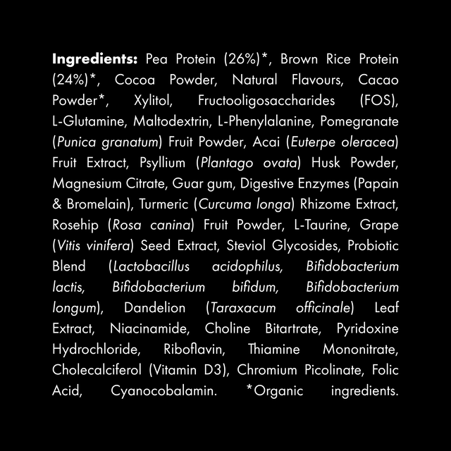INGREDIENTS: Pea Protein (26%)*, Brown Rice Protein (24%)*, Cocoa Powder, Natural Flavours, Cacao Powder*, Xylitol, Fructooligosaccharides (FOS), L-Glutamine, Maltodextrin, L-Phenylalanine, Pomegranate (Punica granatum) Fruit Powder, Acai (Euterpe oleracea) Fruit Extract, Psyllium (Plantago ovata) Husk Powder, Magnesium Citrate, Guar gum, Digestive Enzymes (Papain & Bromelain), Turmeric (Curcuma longa) Rhizome Extract, Rosehip (Rosa canina) Fruit Powder, L-Taurine, Grape (Vitis vinifera) Seed Extract, Steviol Glycosides, Probiotic Blend (Lactobacillus acidophilus, Bifidobacterium lactis, Bifidobacterium bifidum, Bifidobacterium longum), Dandelion (Taraxacum officinale) Leaf Extract, Niacinamide, Choline Bitartrate, Pyridoxine Hydrochloride, Riboflavin, Thiamine Mononitrate, Cholecalciferol (Vitamin D3), Chromium Picolinate, Folic Acid, Cyanocobalamin. *Organic ingredients.